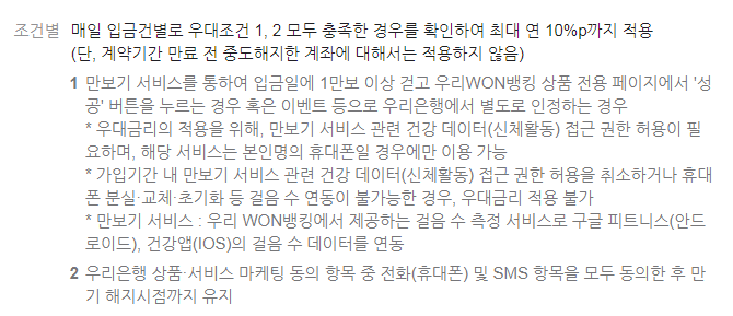 - 우대 금리 : 만보기 서비스를 통하여 입금일에 1만 보 이상 걷고 우리WON뱅킹 상품 전영 페이지에서 '성공'버튼을 누르는 경우 혹은 이벤트등으로 우리은행에서 별도로 인정하는 경우/우리은행 상품, 서비스 마케팅 동의 후 민기해지시까지 유지