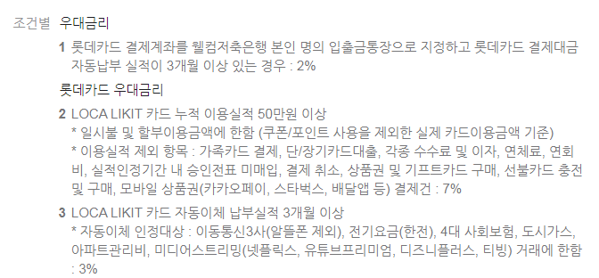 - 우대조건 : 모바일뱅킹에서 신규 가입 후 적금 가입월 직전 6개월 동안 롯데 개인신용카드 이용 실적이 없는 회원으로 [웰컴저축은행 제휴 롯데카드 이벤트 페이지]에서 LOCA LOKIT 카드 혜택을 확인하고 보유한 경우 제공