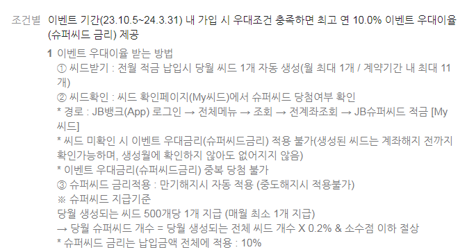 - 우대조건 : 신규가입 후 슈퍼씨드 확인페이지(My씨드)에서 씨드 확인 및 획득, 씨드 미 확인 시 이벤트 우대금리 적용 불가