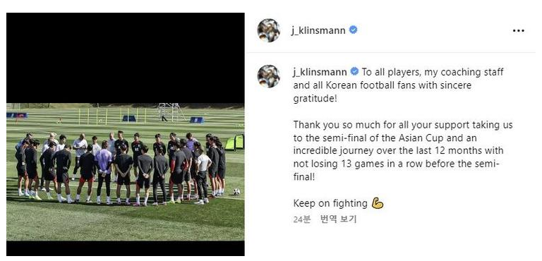 클린스만 감독은 16일 SNS에 축구 대표팀이 모인 사진과 함께 "모든 선수와 코치진, 모든 한국 축구 팬 여러분께 진심으로 감사하다. 아시아축구연맹(AFC) 아시안컵 준결승까지 갈 수 있도록 응원해 주셔서 고맙다. 준결승전 전까지 지난 12개월 동안 13경기 무패 행진과 함께 놀라운 여정이었다"라고 적었으며 "계속 파이팅"(Keep on fighting)이라고 덧붙였습니다.