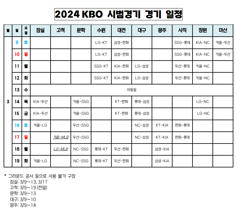 2024KBO 시범경기는 3월 9일 토요일 오후 1시에 5개 구장에서 동시에 시작합니다.