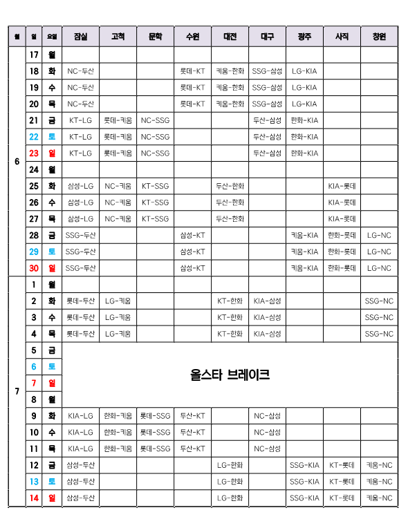 올스타전은 7월 6일 토요일 개최예정이며, 올스타브레이크 기간은 7월 5일 금요일부터 8일 월요일까지 기존 7일에서 4일로 단축되었습니다.