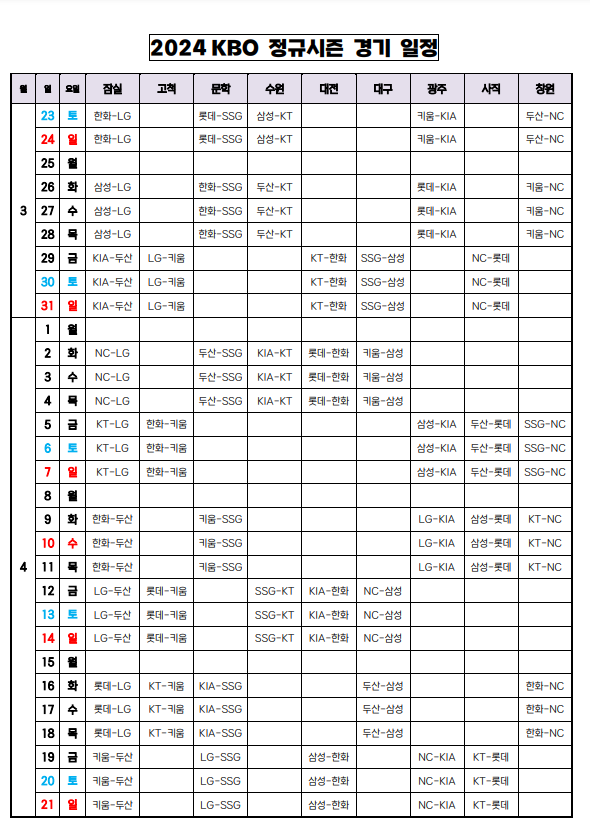 2024 시즌 프러야구의 시범경기 일정과 개막전 일정이 정해졌습니다. 야구의 계절이 다가오는 만큼 프로야구시즌도 점점 다가오는데 이번 2024 시즌 KBO 프로야구 일정에 대해 알아보겠습니다.