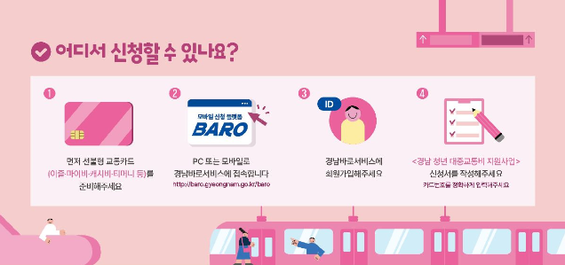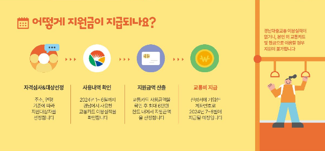 - '경남바로서비스' 온라인 신청 - 지원조건 해당여부 확인 후 대상자 선정 - 도내 대중교통 이용내역 확인 - 지원금 산출 - 지원금 지급 순으로 진행됨