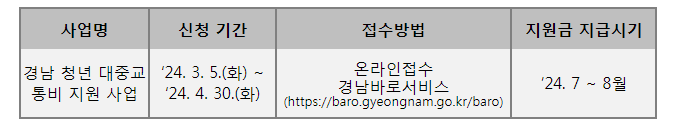 청년 대중교통비 지원은 2024년 3월 5일부터 4월 30일까지 두 달간 '경남바로서비스'를 통해 신청할 수 있습니다. '경남바로서비스'에서 선불형 교통카드를 등록하면 되며, 해당 대상자가 선불형 교통카드로 경남 시내버스와 농어촌버스, 경전철(김해-부산), 지하철(양산-부산)을 이용한 내역을 지원합니다.