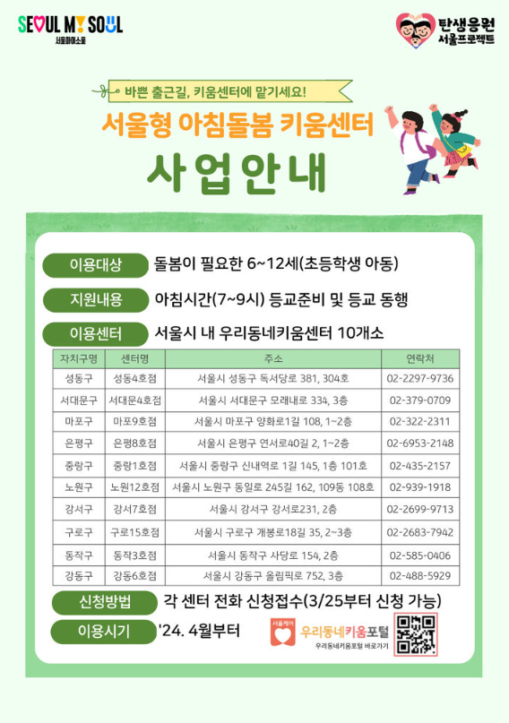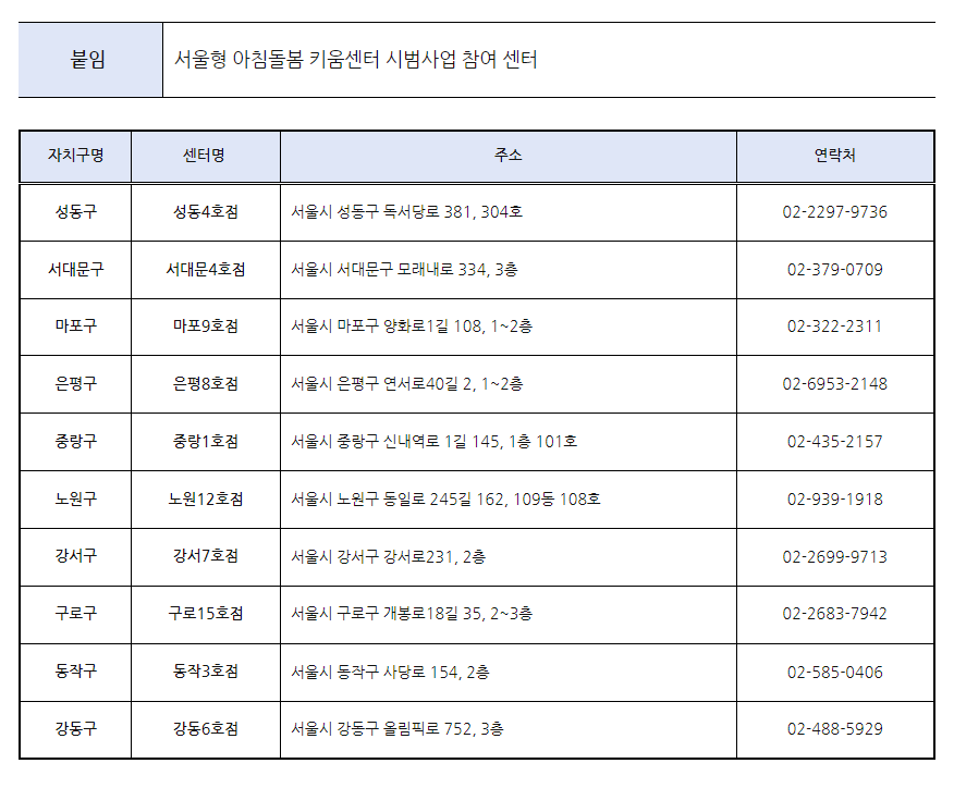 서울형 아침돌봄 대상자는 초등학교에 다니는 자녀를 오전 7시부터 9시 사이에 우리동네 키움센터에 맡기고 가면, 돌봄 교사가 등교 준비를 도와주고 학교까지 동행해 주는 사업입니다. 서울시는 우선 시범사업으로 4월부터 5개 권역별(도심권, 서북권, 서남권, 동북권, 동남권)로 각 2개소씩, 총 10개 키움센터에서 '서울형 아침돌봄 키움센터'를 운영합니다. 연말까지 시범운행 후 아침 틈새 돌봄 수요에 따라 운영을 확대할 계획입니다.