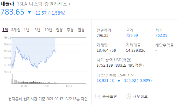 클럽하우스 관련주 - 테슬라 주가