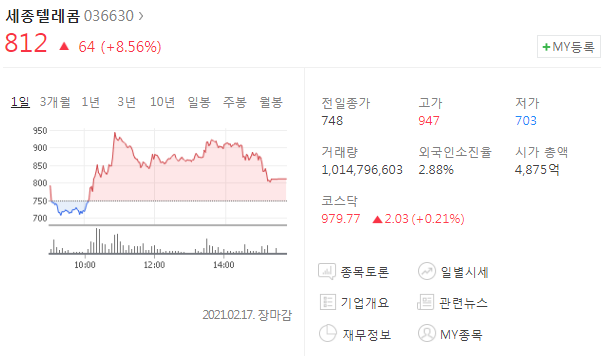 클럽하우스 관련주 - 세종텔레콤 036630 주가