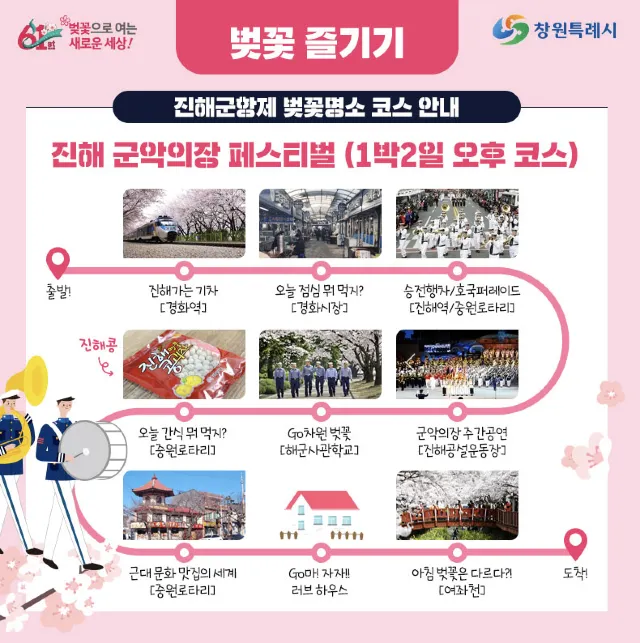 축제의 대표 프로그램으로는 군악의장 페스티벌, 야간 경관 조명쇼, 벚꽃 야시장, 그리고 불꽃놀이 등이 있으며, 진해의 역사와 문화를 즐길 수 있는 체험형 이벤트도 마련되어 있습니다.