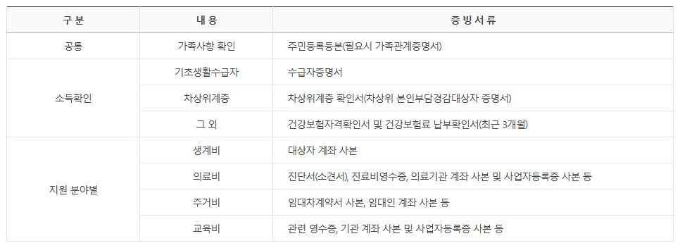 ※ 각 지역의 상황에 따라 제출 서류와 심사 기준이 다를 수 있으며, 긴급상황일 경우 상담 후 간소화 절차로 빠른 지원이 가능합니다.