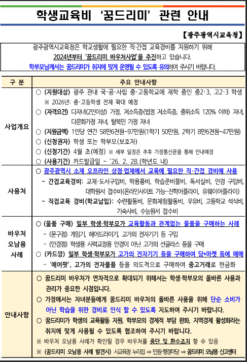 “학업에 필요한 건, 걱정 말고 지원받으세요! 광주 학생들을 위한 꿈드리미 바우처, 지금 바로 확인하세요.”