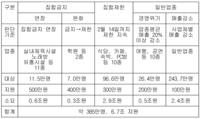 - 500만 원 집합 금지(연장) : 실내체육시설, 노래연습장, 유흥업소 11종 11만 5000개 4차 재난지원금 지원