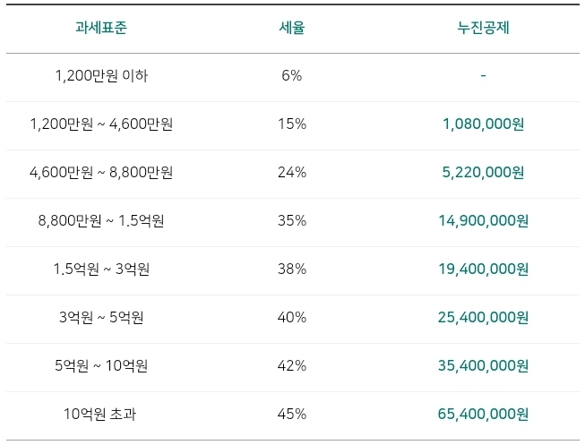 - 세율 적용 방법 = 과세 표준 x 세율 - 누진공제액