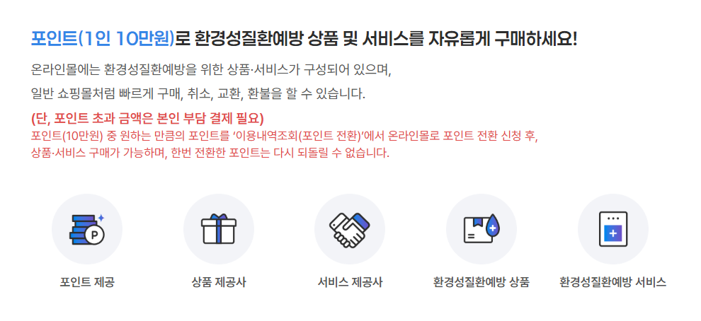 - 10만원 상당의 이용권(포인트)을 제공하여 환경성 질환 예방 상품, 서비스 및 진료비 이용 가능