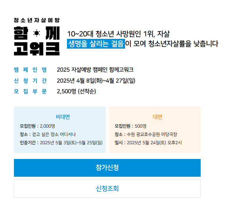 2025 자살예방 캠페인 '함께고워크'에 참여해 청소년 자살률을 낮추는 데 힘을 보태세요. 청소년들이 자살 예방을 위한 중요한 활동에 참여할 수 있는 기회를 제공합니다. 이제 여러분도 이 캠페인에 참여하여 생명을 살리는 첫 걸음을 함께 내디딜 수 있습니다.
