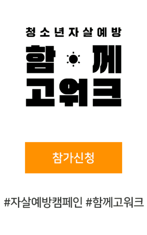 2025 자살예방 캠페인 '함께고워크'는 청소년 자살 문제를 예방하고 생명을 살리는 중요한 걸음을 함께 나아갑니다. 이 캠페인에 참여해 청소년 자살률을 낮추는 데 동참하세요!