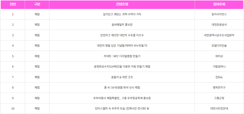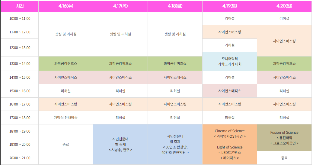 | 과학 공연 | 과학을 주제로 한 공연 및 실험 쇼 | 2025. 4. 16 - 4. 20 |