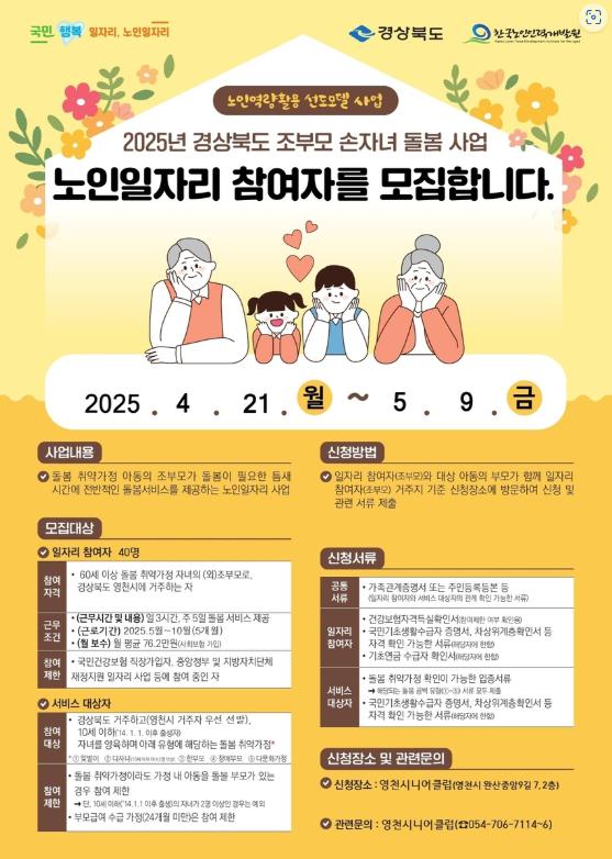 돌봄이 필요한 가정의 어린이들에게 사랑과 지원을 전할 기회! 영천시가 '조부모 손자녀 돌봄사업'에 참여할 40명을 모집합니다.