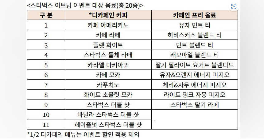 - 할인 대상 음료: 디카페인 커피 11종, 카페인 프리 음료 9종