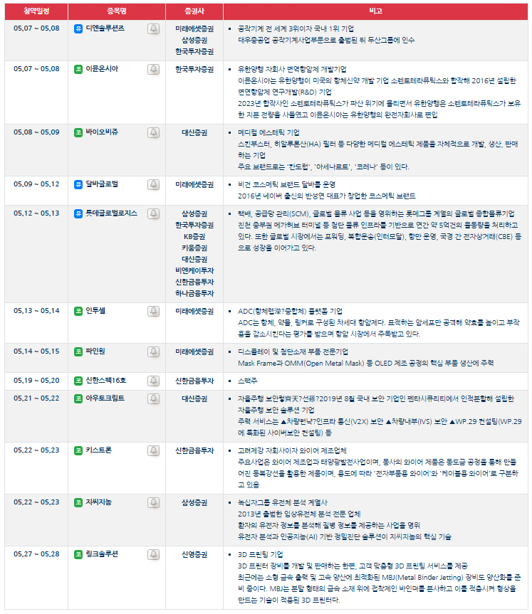 | 디엔솔루션즈 | 05.07 ~ 05.08 | 미래에셋증권, 삼성증권, 한국투자증권 |