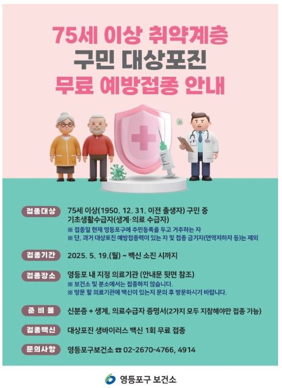서울 영등포구가 75세 이상 기초생활수급자 1200명을 대상으로 취약계층 어르신 대상포진 무료 예방접종을 시행합니다. 건강 사각지대에 놓인 고령층에게 꼭 필요한 이 지원 정책, 지금 자세히 확인하세요.