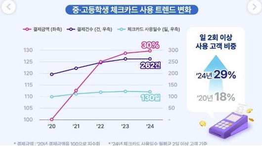 코로나19 이후 비대면 결제가 일상화되면서, 중고등학생들도 체크카드 사용이 증가했습니다. NH농협은행에 따르면, 하루 두 번 이상 체크카드를 사용하는 비율이 2020년 18%에서 2024년 29%로 증가했습니다.