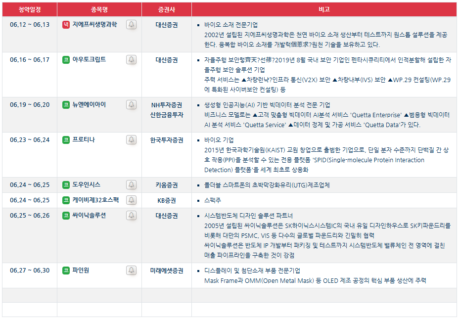 2025년 6월 공모주 주요 종목별 공모가 및 청약 일정