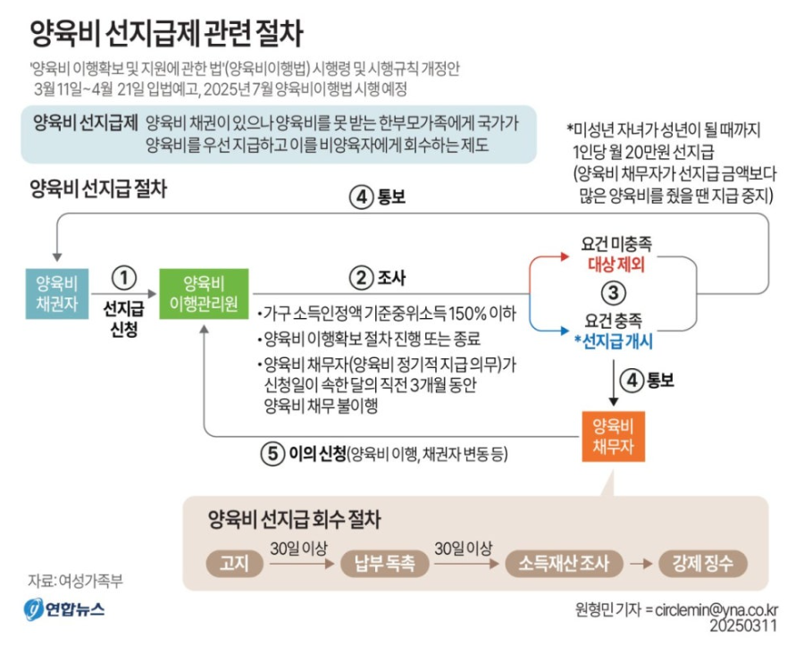 2025년 7월 1일부터 시행되는 양육비 선지급제는 양육비를 받지 못해 어려움을 겪는 채권자를 위해 국가가 먼저 양육비를 지급하고, 이후 양육비 채무자에게 이를 회수하는 새로운 지원 정책입니다. 특히, 양육비 채무자로부터 3개월 이상 또는 3회 연속 지급받지 못한 기준중위소득 150% 이하 가구의 미성년 자녀가 선지급 대상에 포함됩니다. 이 제도는 기존 양육비 이행확보 노력에도 불구하고 양육비를 받지 못한 상황을 해소하려는 취지로 마련되었습니다. 양육비 지급기간은 미성년 자녀가 성년에 이를 때까지 보장되며, 월 20만원의 금액이 지급됩니다.