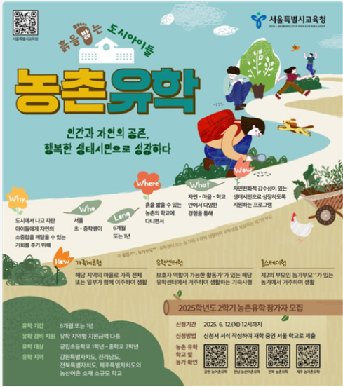 서울시교육청은 2025학년도 2학기 농촌유학 프로그램에 참여할 신규 학생을 모집한다고 1일 밝혔다. 특히 이번 신청부터는 제주도가 유학 지역으로 새롭게 포함돼 학생들 선택지가 넓어졌다.