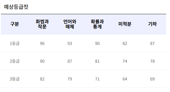 | 정답지 기준 등급컷 | 1등급 컷 국어 96점, 수학 90점 등 | 선택과목별 편차 고려 필수 |