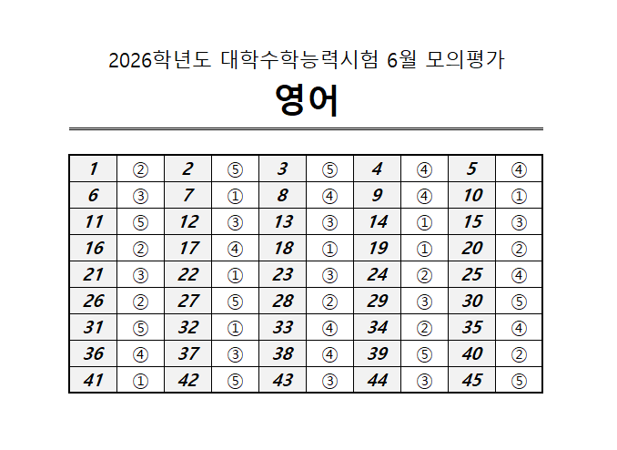 2026학년도 6월 모의고사의 정답지 및 예상 등급컷을 한눈에 확인해보세요! 국어, 수학, 영어, 탐구 영역별 최신 채점 기준과 등급 경계를 분석하여, 수험생의 실전 감각을 높이는 실질 정보를 제공합니다. 정답지와 함께 제공되는 예상 등급컷은 전략 수립에 큰 도움이 되며, 실제 시험 대비 전략에도 바로 적용 가능합니다.