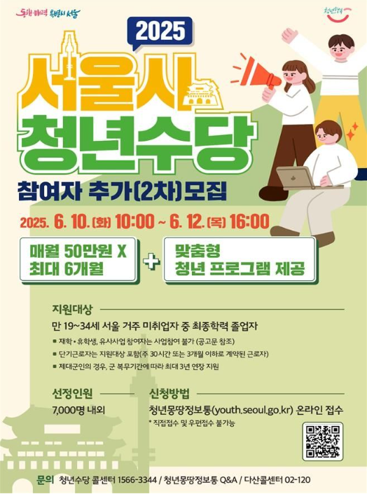 서울시 청년수당 추가 모집이 시작됐습니다. 서울 거주 미취업 청년이라면 월 50만 원씩 최대 6개월간 활동 지원금을 받을 수 있는 기회를 놓치지 마세요! 신청 조건, 일정, 우선 선발 기준까지 꼼꼼히 정리해드립니다. 청년수당은 단순한 금전 지원을 넘어서 현직자 멘토링, 진로 코칭 등 다양한 성장지원 프로그램도 함께 제공되며, 신청은 온라인으로 간편하게 가능합니다. 특히 올해는 AI 프로그램 구매 허용까지 확대돼 활용도가 더욱 높아졌습니다. 서울시의 2025년형 청년 복지정책 중 가장 실질적인 혜택으로 꼽히는 청년수당, 지금 바로 알아보세요.
