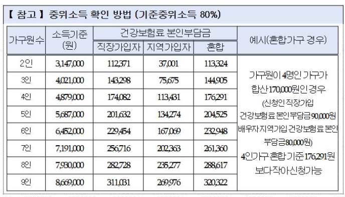 | 가구 인원 | 기준 중위소득 80% | 건강보험료 기준(직장가입자) |