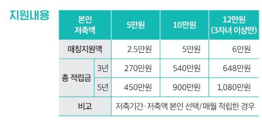 | 매달 5~12만원 저축 | 서울시가 50% 매칭 적립 | 중도 해지 시 매칭금 제한 |