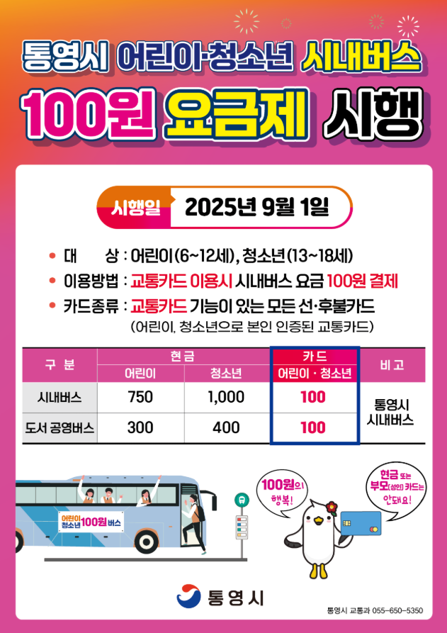 2025년 9월 1일부터, 통영시에서는 어린이·청소년 대상 시내버스 요금을 100원으로 할인하는 정책을 시행합니다. 교통카드를 이용한 본인 인증이 필수이며, 현금 또는 보호자 카드 이용 시 해당 혜택은 적용되지 않습니다.