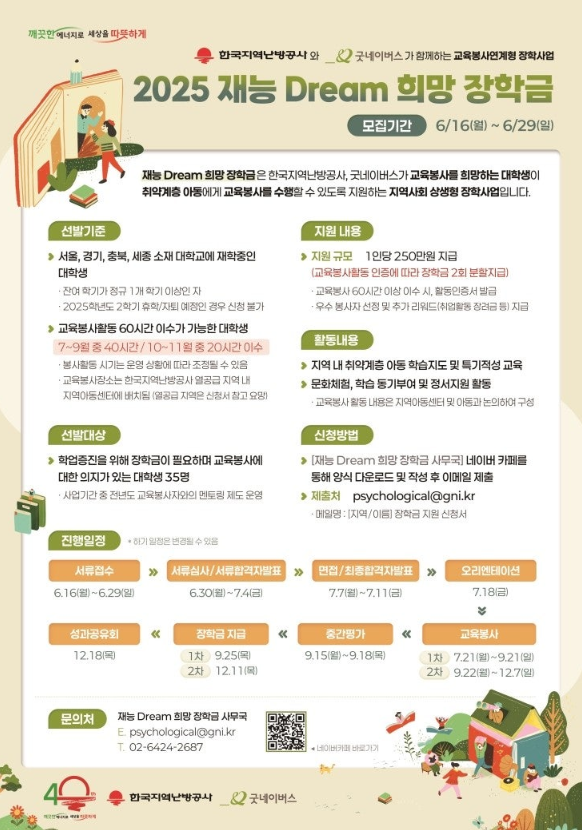 장학금 지급뿐만 아니라, 지역 아동 대상의 교육 콘텐츠 기획 및 운영, 문화 체험 활동 지원 등 커스터마이징된 교육 프로그램을 통해 실무형 역량도 함께 키울 수 있는 점이 가장 큰 장점입니다. 신청은 이메일(psychological@gni.kr) 또는 전용 카페를 통해 간편하게 제출할 수 있으며, 선발 후에는 사전 오리엔테이션과 활동 매뉴얼 제공을 통해 부담 없이 참여가 가능합니다.