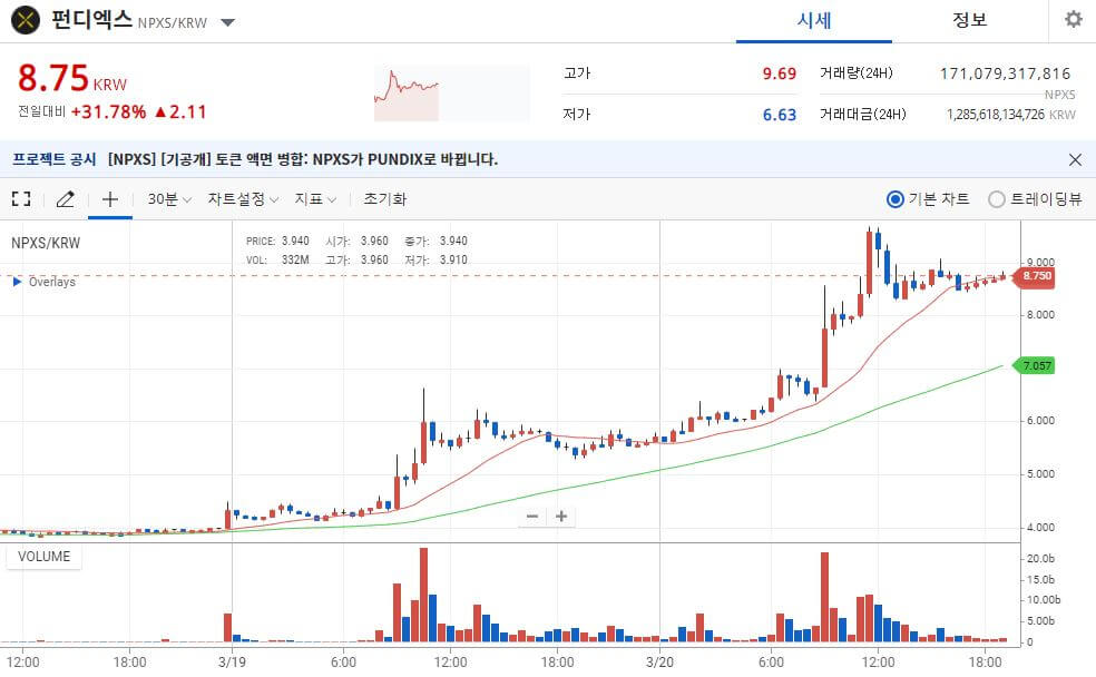 펀디엑스의 액면병합과 자체 개발한 POS 기기를 소매점에 무상으로 공급으로 인하여 많은 소매점들의 참여가 많아질 것으로 예상되어 펀디엑스 네트워크 사용자들이 많이 생길 것으로 보입니다. 그로 인하여, 2021년 3월 20일 20시 코인 시세가 전일 대비 31.35% 상승하였습니다. 이 부분들이 작용을 하지 않았나 싶습니다.