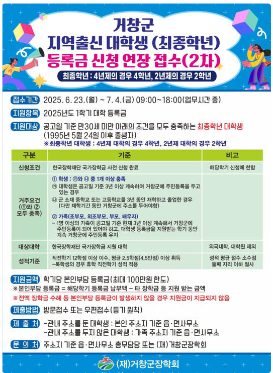 거창군장학회의 등록금 지원사업은 지역 청년들에게 실질적인 도움이 되는 제도입니다. 자격 조건이 맞는다면 망설이지 말고 신청해보세요. 경제적 부담을 덜어내고, 진로에 더욱 집중할 수 있는 기회가 될 수 있습니다. 이번 연장 접수는 단 한 번의 기회일 수 있으니, 꼭 기한 내에 신청을 마무리하시길 바랍니다.