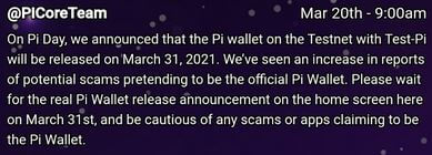 On Pi Day, we announced that the Pi wallet on the Testnet with Test-Pi will be released on March 31, 2021. We’ve seen an increase in reports of potential scams pretending to be the official Pi Wallet. Please wait for the real Pi Wallet release announcement on the home screen here on March 31st, and be cautious of any scams or apps claiming to be the Pi Wallet.