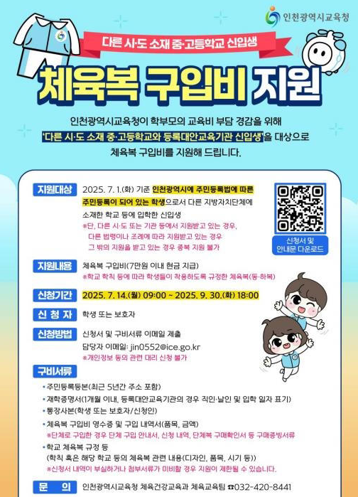 인천광역시교육청이 타지역 중·고등학교에 입학하는 신입생의 체육복 구입비를 전폭적으로 지원합니다. 이번 지원은 학부모의 경제적 부담을 완화하고, 더 많은 학생이 공평한 출발선을 가질 수 있도록 마련되었습니다.