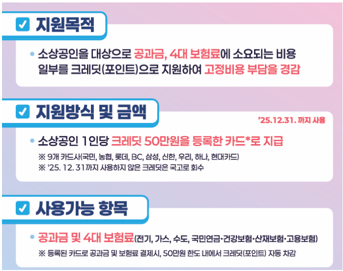 정부에서 지원하는 소상공인 부담경감 크레딧은 전기·가스·수도요금과 4대 보험료 납부에 쓸 수 있도록 50만 원의 예산을 카드 형태로 지급하는 제도로, 신청부터 사용까지 단계별 준비가 필요합니다. 여기서는 실제 사례와 함께 상세한 절차를 안내해 드립니다.