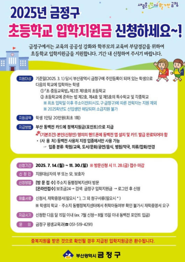 - 지원 대상 확인: 2025년 3월 1일 기준 금정구 주민등록이 되어 있고, 초등학교에 최초 입학하는 학생의 보호자.