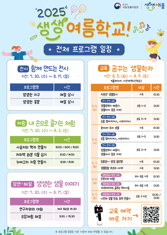 - 프로그램 일정 확인 및 사전예약2025년 7월 30일부터 8월 17일까지 운영되며, 일부 체험은 국립생물자원관 홈페이지에서 사전예약이 필요합니다.