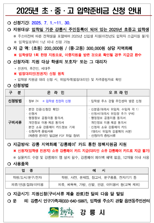 | 지원 대상 | 강릉시 초·중·고 신입생 |