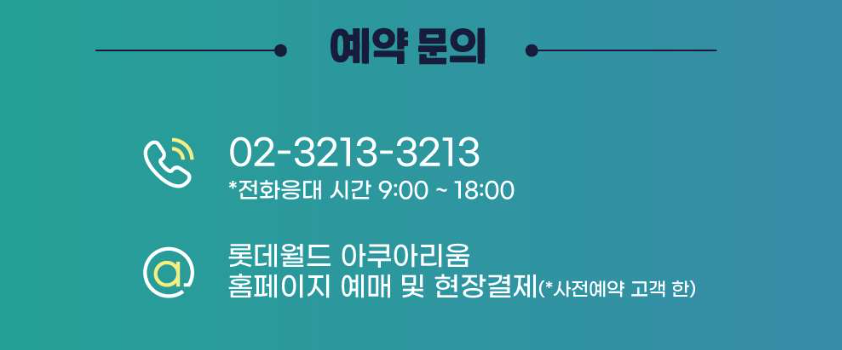 | 예약 방식 | 현장 구매 or 앱 | 롯데월드 아쿠아리움 홈페이지 예매 및 현장결제 |
