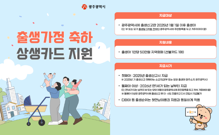 광주시는 새 생명의 탄생을 축하하고 육아의 첫걸음을 응원하기 위해, 모든 출생가정에 50만 원 상생카드를 지원합니다. 이 축하금은 지역과 가족이 함께 만드는 따뜻한 미래를 의미합니다.