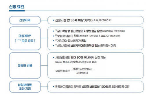 - 자격 요건 확인: 만 55세 이상, 보험료 완납, 계약자와 피보험자 동일, 약관대출 잔액 없음