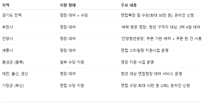 | 1 | 지역별 정책 확인 | 지자체마다 정장 대여 횟수, 면접 수당 조건이 달라요 |