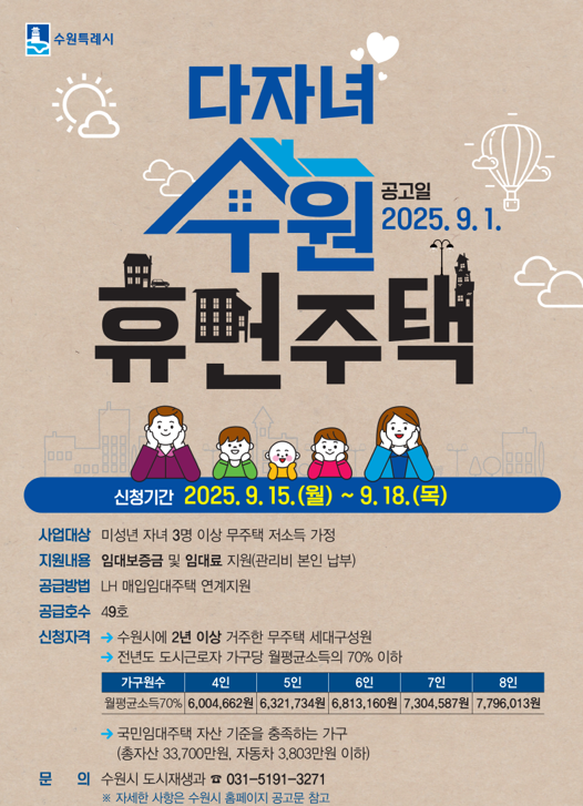 | 신청 자격 | 수원시 2년 이상 거주, 미성년 자녀 셋 이상, 무주택 |